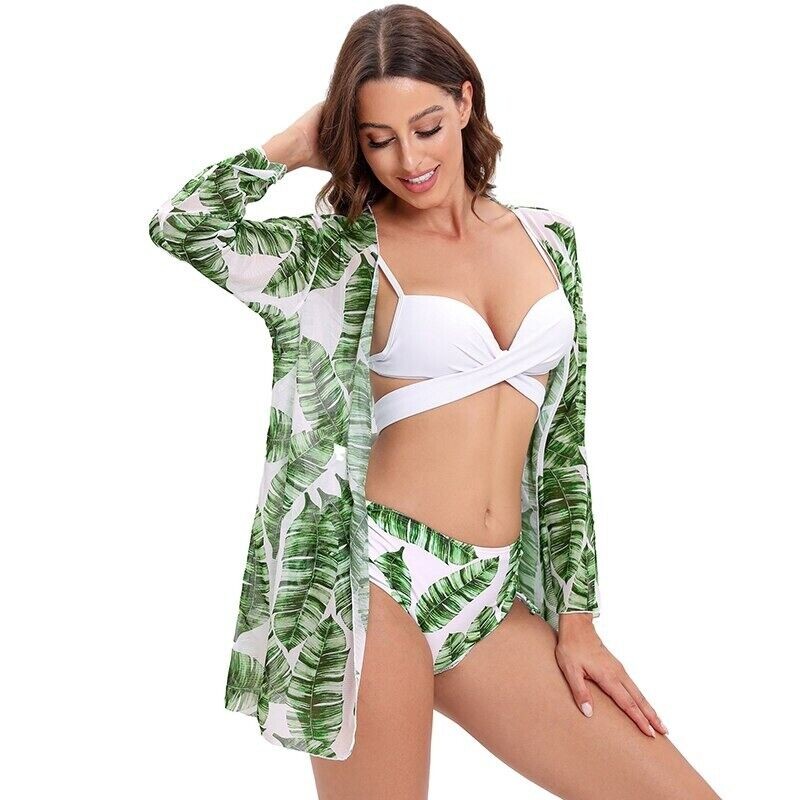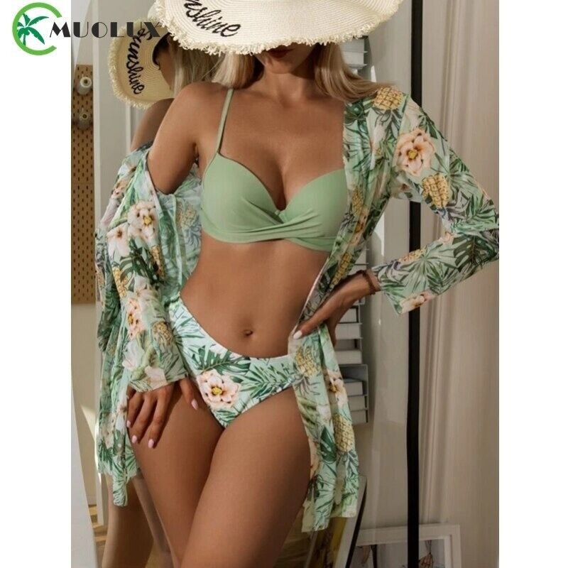 High Waist 3 Piece Bikini Set With Cover Up 2022 Women Swimsuit Print Long...