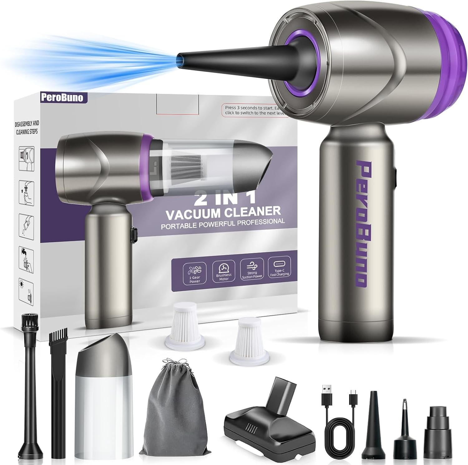 PeroBuno Air Duster for Computers, Mini Vacuum 2-in-1, 160000RPM Compressed Air, 2 Gear Brushless Motor Rechargeable Air Blower - Cordless Canned Air - Keyboard Cleaner