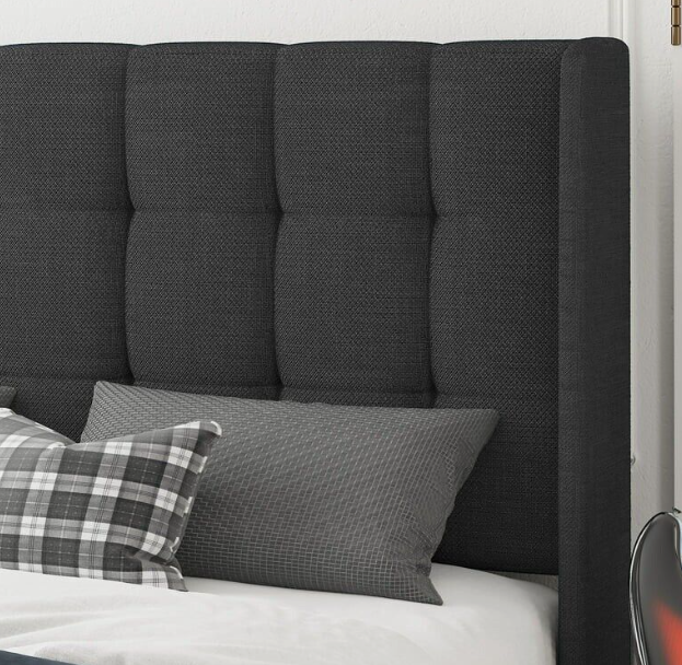 Queen size Platform Bed With Wingback Headboard, Square Stitched Style Dark Grey