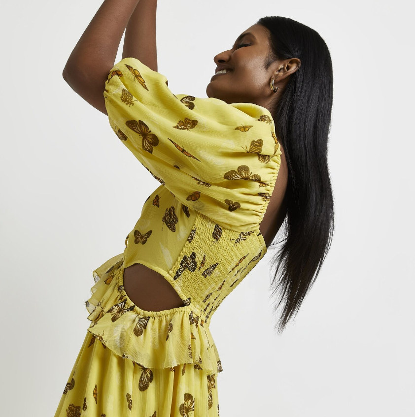 River Island Womens Maxi Dress Yellow Print Cut Out Stylish Short Sleeves