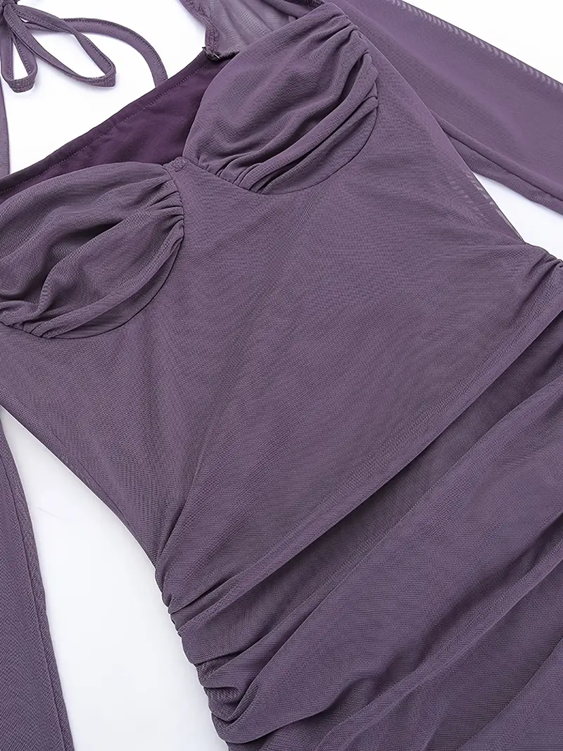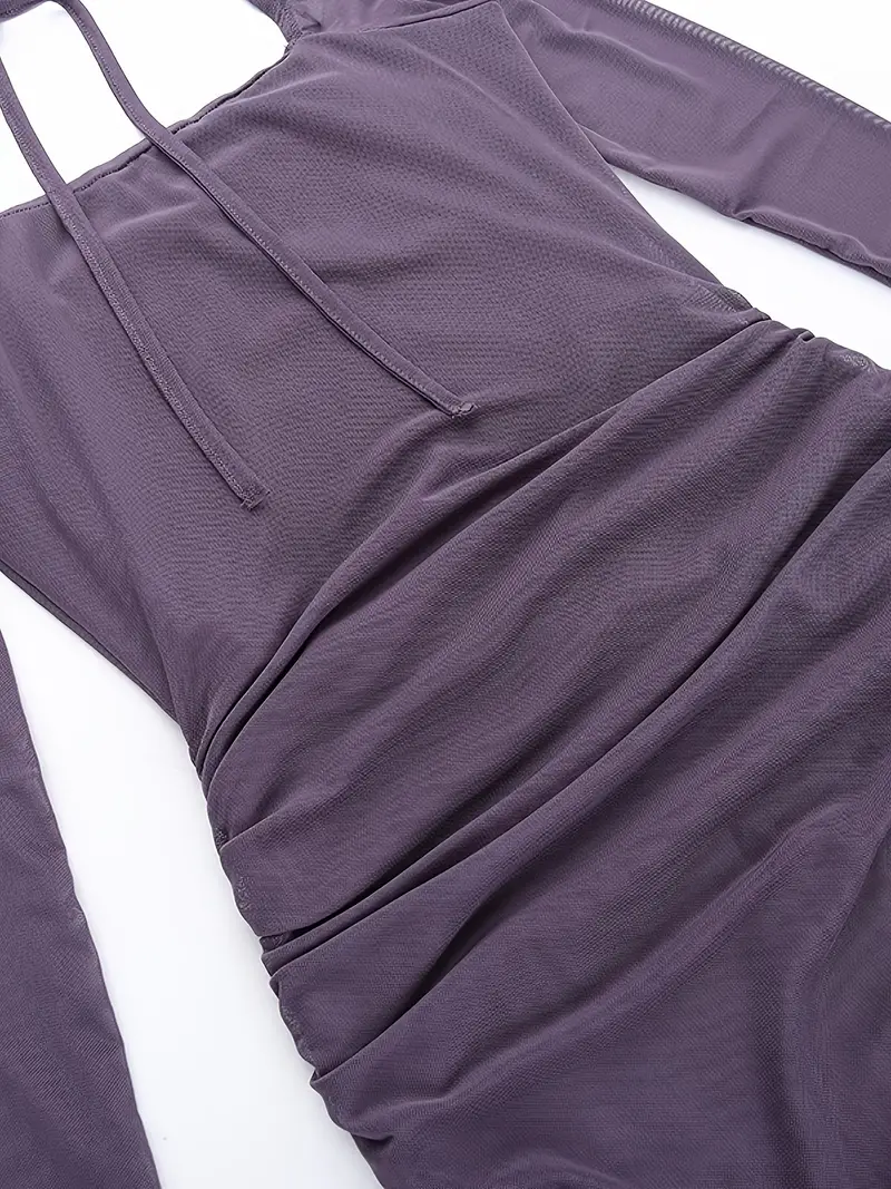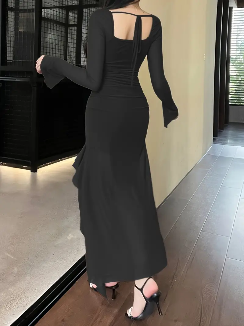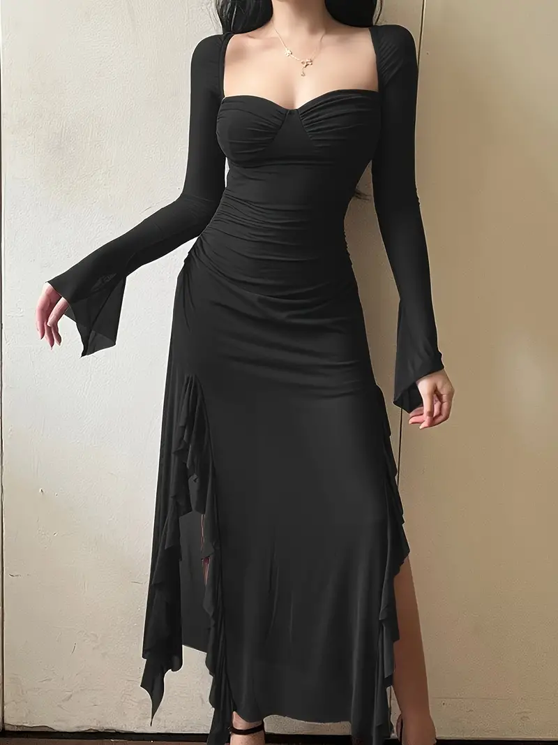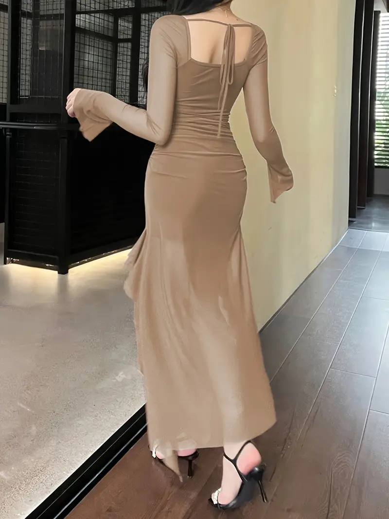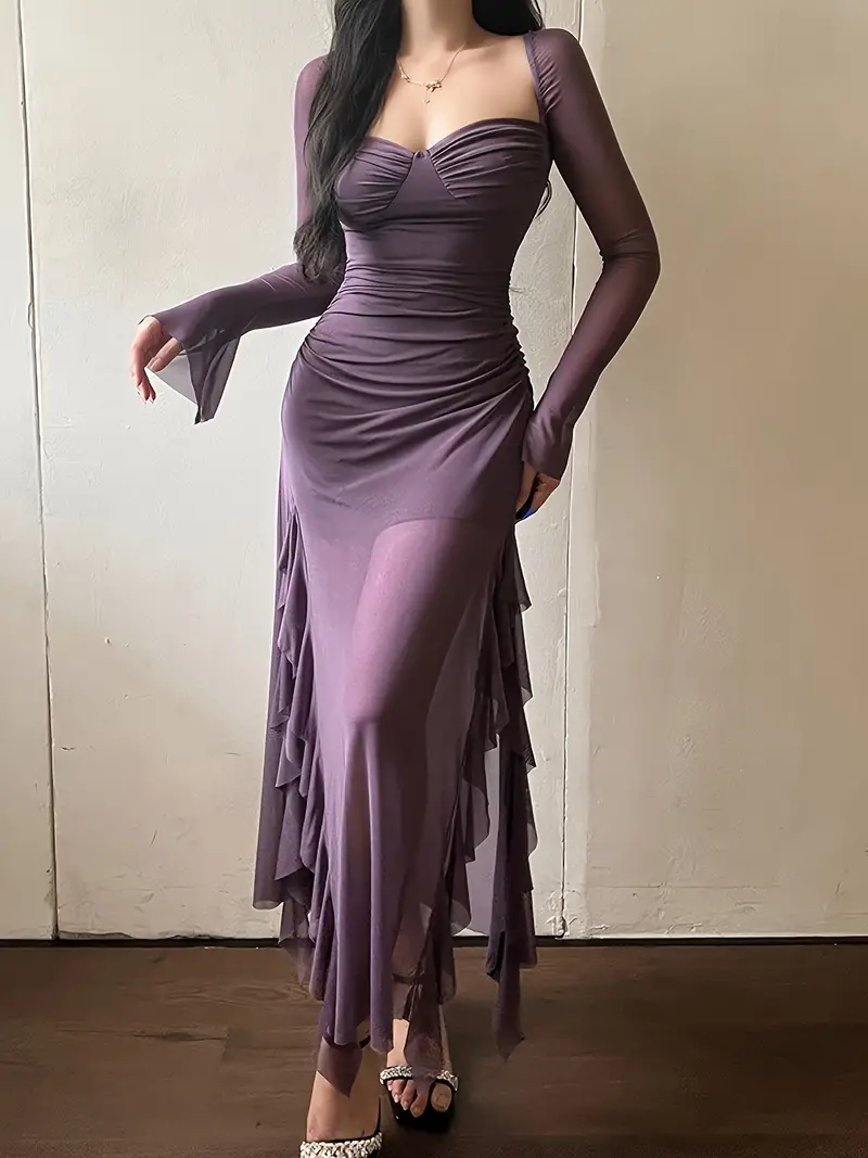 Solid Ruffle Trim Split Asymmetrical Dress, Elegant Flare Sleeve Mesh Ruched Dress, Women's Clothing
