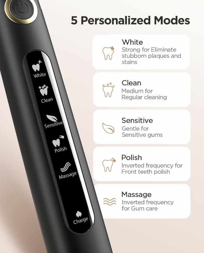 • ♥【5 Adjustable Modes 5 Modes of White, Clean, Sensitive, Polish, Massage to suit different conditions of teeth and gums; keep your teeth healthy and strong for a lifetime