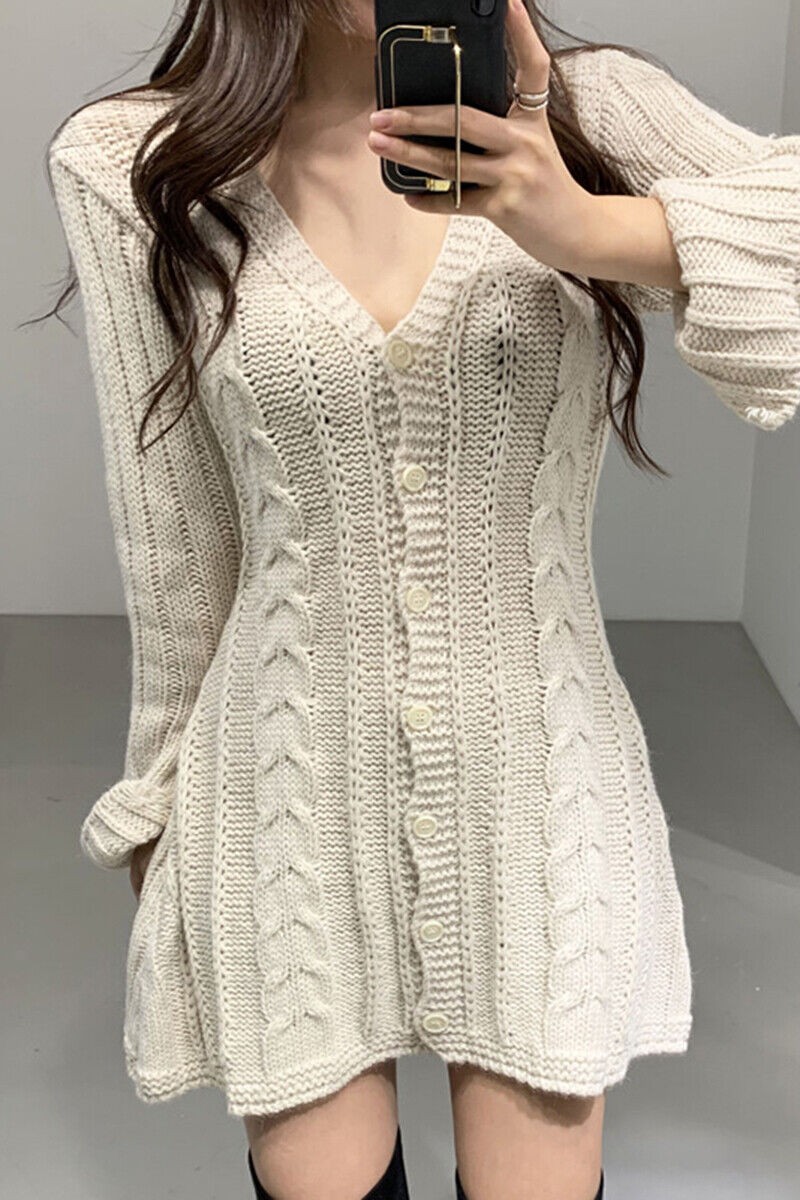 Womens V Neck Long Sleeves Knitted Sweater Dress Korean Fashion Mini Skirt Tops